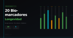 - Los 20 biomarcadores de longevidad que importan: guía visual con rangos óptimos (2026)Project 170 · Guía visual 2026 Los biomarcadores delongevidad que importan 20 marcadores clave organizados por sistema. Qué miden, rangos óptimos según la evidencia científica y por qué cada uno predice tu trayectoria de envejecimiento saludable. Rango de riesgo Subóptimo Aceptable Óptimo longevidad Elite ✦ Todos (20) ❤️ Cardiovascular ⚡... Lee más: Los 20 biomarcadores de longevidad que importan: guía visual con rangos óptimos (2026)
